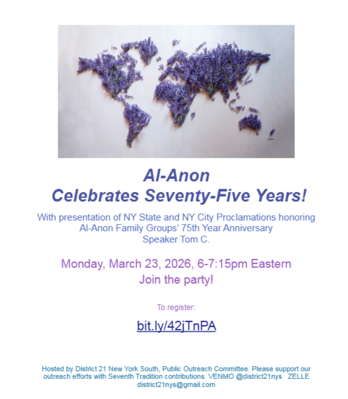 With presentation of NY State and NY City Proclamations honoring Al-Anon Family Groups’ 75th Year Anniversary Speaker Tom C. Join the party!