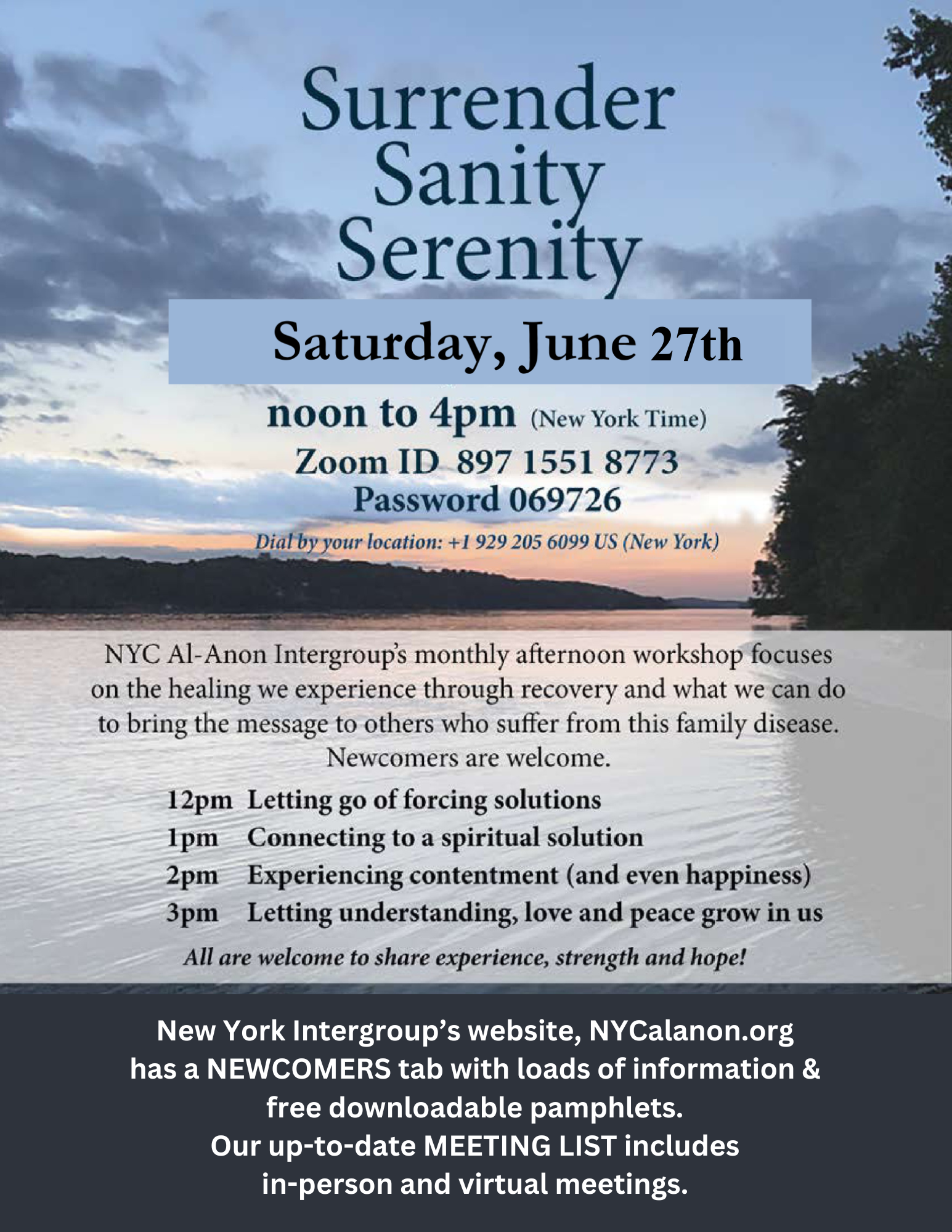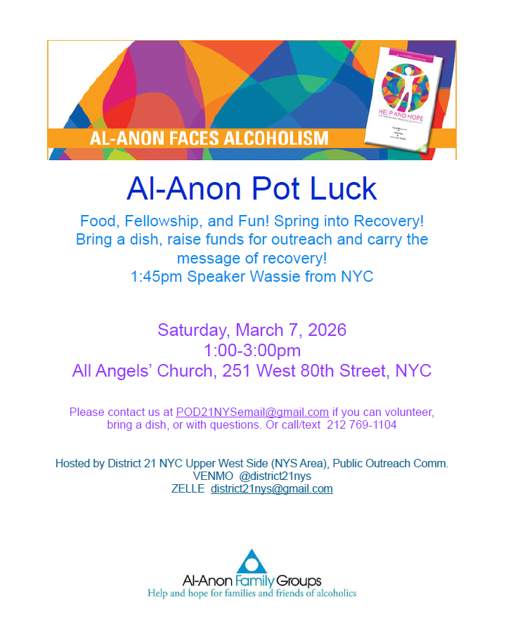 NYC Intergroup presents our monthly Al-Anon Workshop Accepting Reality One Day at a Time Saturday, March 28, 2026 Noon to 4:00 PM